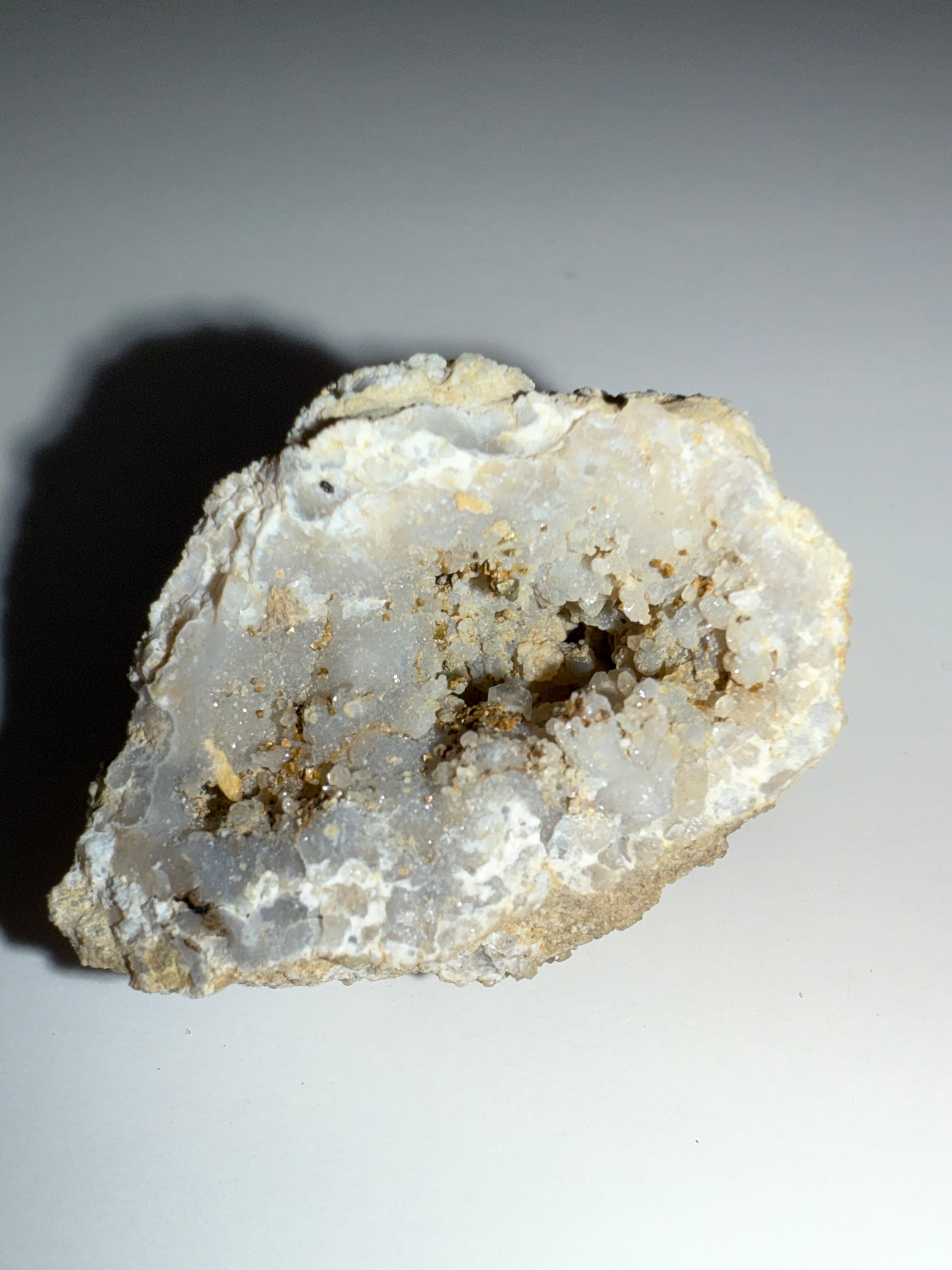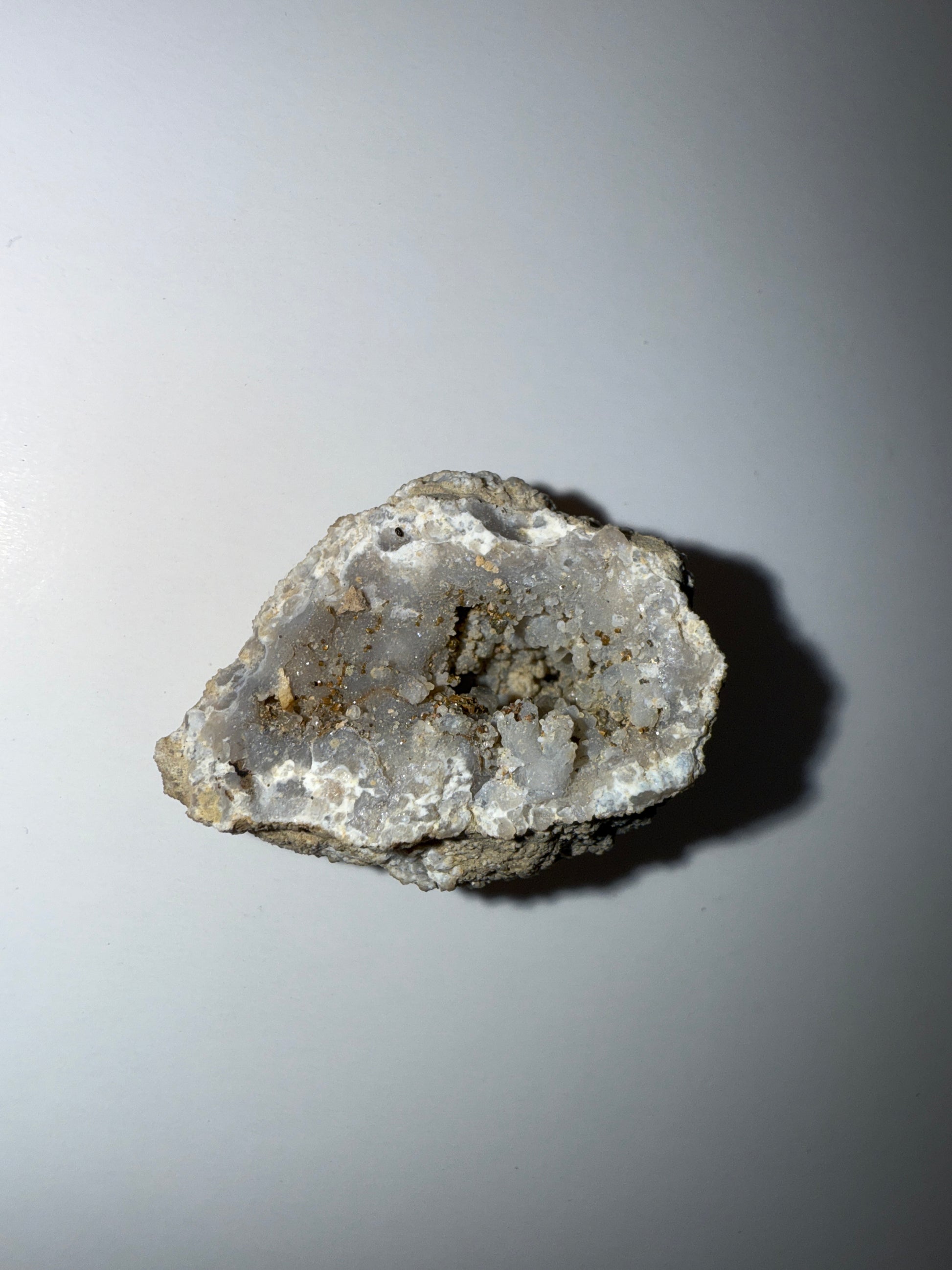 This beauty has mini pyrite cubes, chalcopyrite, and cube calcite inclusions covered with quartz druzy crystals. This is an unpolished partial of a small geode. All crystals are mined by hand by me in the US.