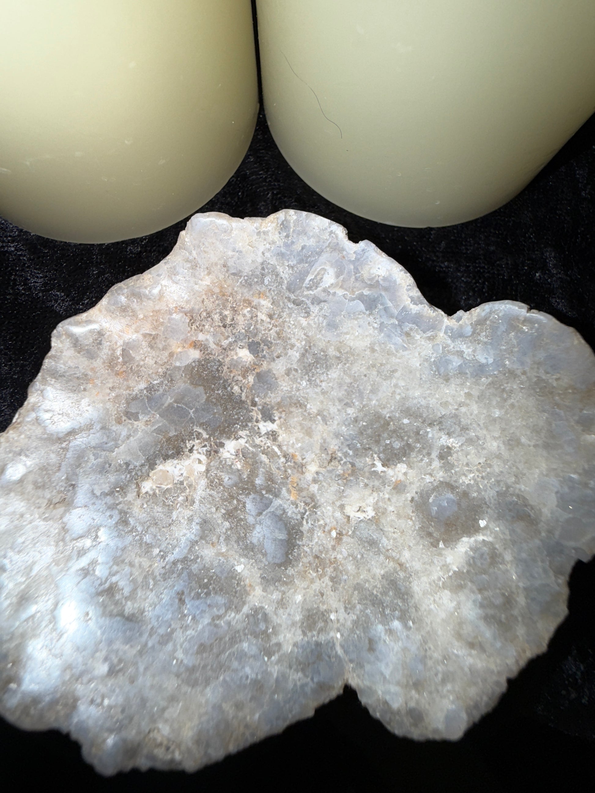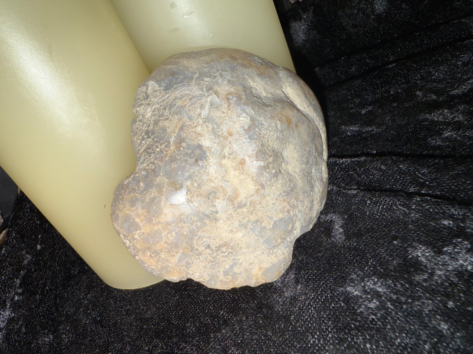 “Rainbow septarian”? I totally made it up. This stone has the same components and was formed in the exact same way as regular septarian, except these nodules I have found come in beautiful pastel colors, mostly blue, purple, and yellow with touches of pink occasionally. Lots of other random mineral inclusions. This particular piece leans more blue, purple and yellow. Subtle flat bottom so it sits still nicely. Carved just thin enough to see it’s transparent without breaking through completely anywhere. Blue Calcedony, quartz, aragonite, ankerite, and calcite. Hand mined, hand carved, ethically sourced.
